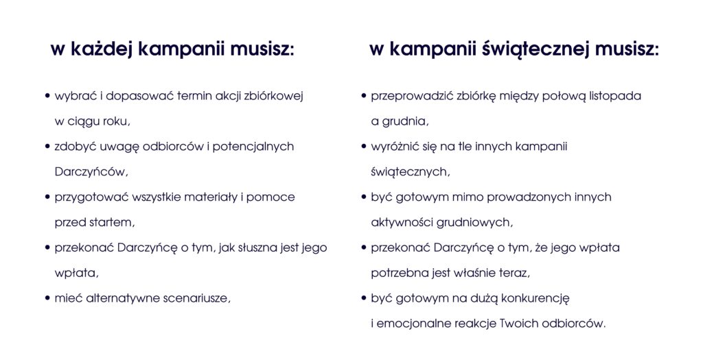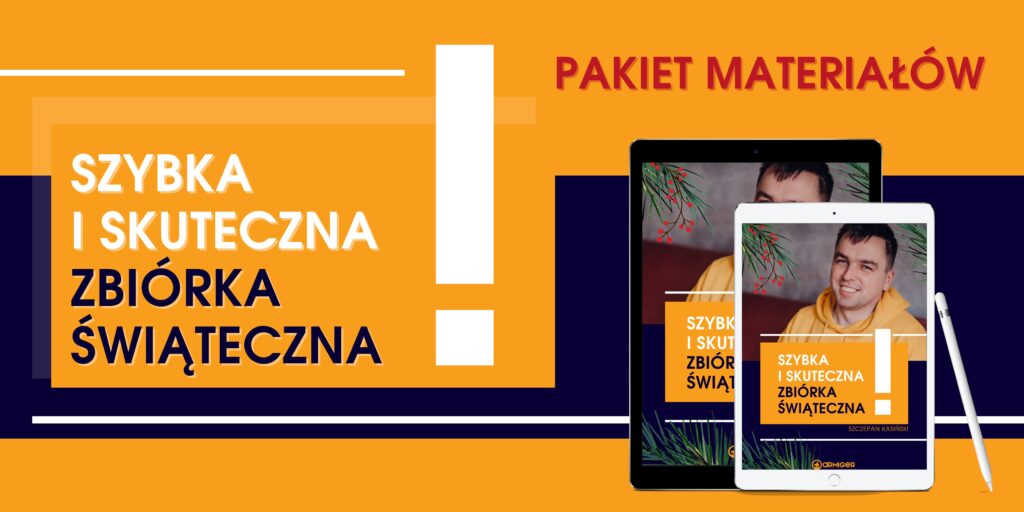 • checklista kampanii świątecznej, czyli co musisz przygotować, aby sprawnie przeprowadzić zbiórkę – od strony zbiórkowej, przez działania promocyjne, po obsługę Darczyńców,